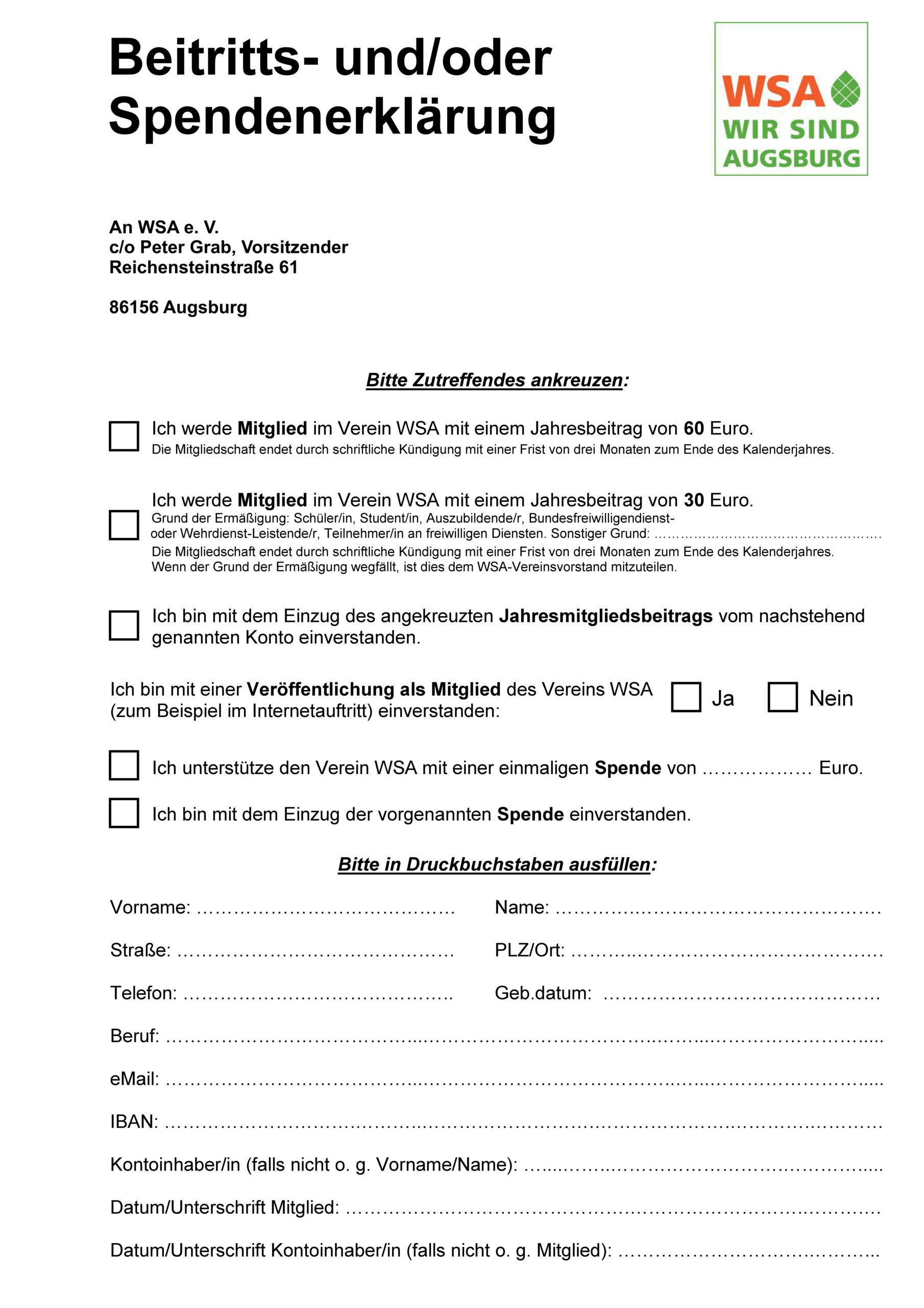 Mit Ihrer Mitgliedschaft unterstützen Sie die kommunalpolitische Arbeit der Bürgervereinigung WSA e. V. (der Mitgliedsbeitrag beträgt 60 Euro im Jahr, im Bedarfsfall beträgt der ermäßigte Jahresbeitrag 30 Euro). Selbstverständlich können Sie gegebenenfalls die Mitgliedschaft jedes Jahr zum Jahresende mit einer Frist von drei Monaten kündigen. Besonders bequem ist für Sie, wenn wir Ihren Mitgliedsbeitrag per Lastschrift einziehen können – dann müssen Sie sich nicht darum kümmern. Wenn Sie Mitglied bei WSA werden möchten, füllen Sie bitte das Beitrittsformular aus und mailen Sie es uns unterschrieben und eingescant zurück an info@augsburg-wsa.de.